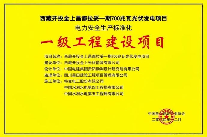 西藏開投金上拉妥一期700MW光伏發(fā)電項目于2021年12月13日取得備案批復(fù)文件,2024年12月底主體工程建設(shè)完成,具備并網(wǎng)發(fā)電條件,并于當年12月順利通過電力建設(shè)工程安全生產(chǎn)標準化一級評審,榮獲中國電力建設(shè)企業(yè)協(xié)會頒發(fā)的“電力安全生產(chǎn)標準化一級工程建設(shè)項目”榮譽。