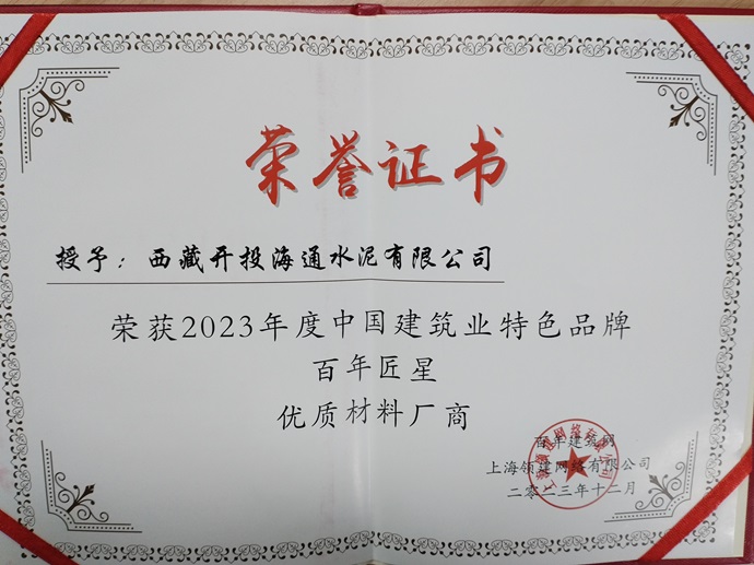 西藏開(kāi)投海通水泥公司榮獲中國(guó)建筑業(yè)特色品牌百年匠星優(yōu)質(zhì)材料廠(chǎng)商榮譽(yù)稱(chēng)號(hào)