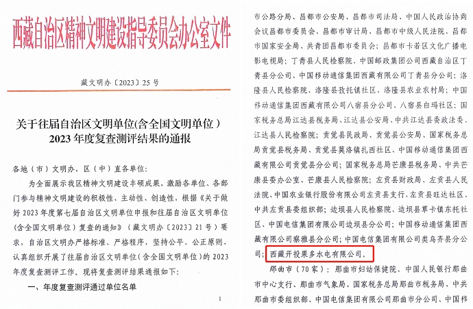 果多水電公司成功續(xù)評(píng)第七屆西藏自治區(qū)文明單位