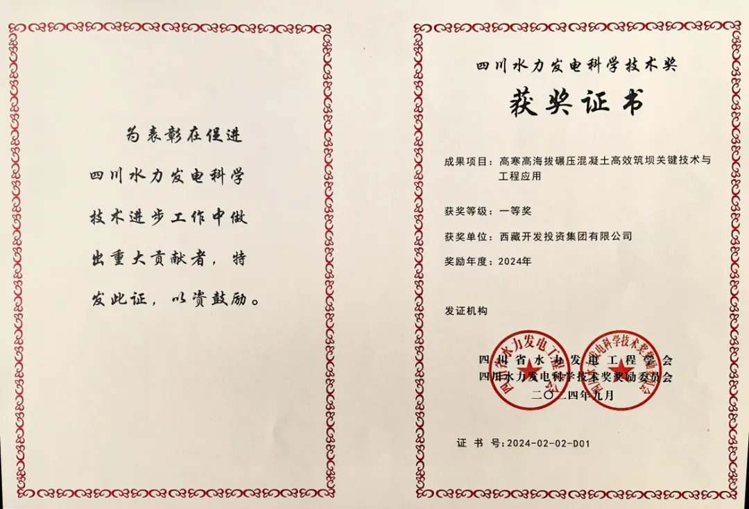 9月25日,四川省水力發(fā)電工程學會2024年度學術年會在成都召開,并舉辦2024年四川水力發(fā)電科學技術獎頒獎典禮,西藏開投集團果多水電站創(chuàng)新成果“高寒高海拔碾壓混凝土高效筑壩關鍵技術與工程應用”榮獲四川水力發(fā)電科學技術獎一等獎。