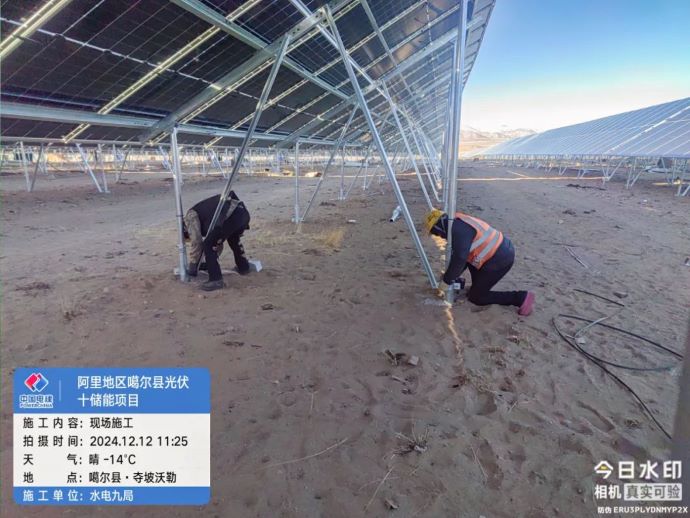 ▲噶爾光伏發(fā)電項目,現場施工人員加固光伏板支架。