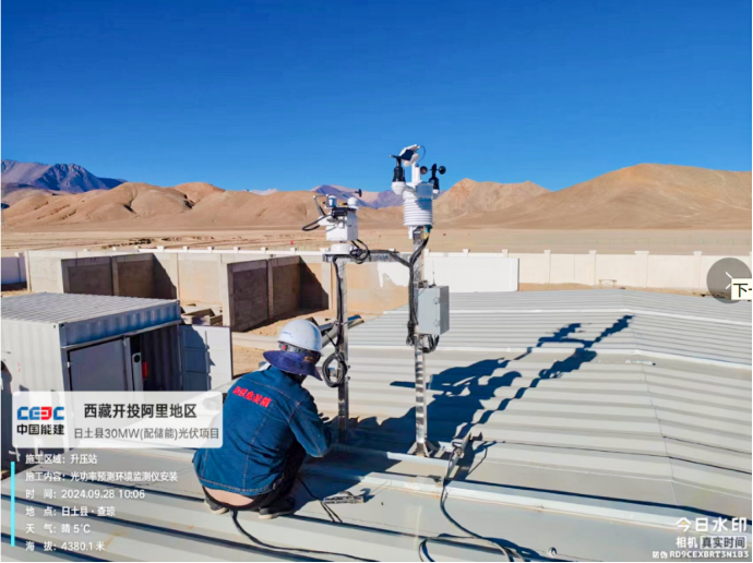 ▲日土光伏項目,現場施工人員開展光功率預測環(huán)境檢測儀安裝作業(yè)。