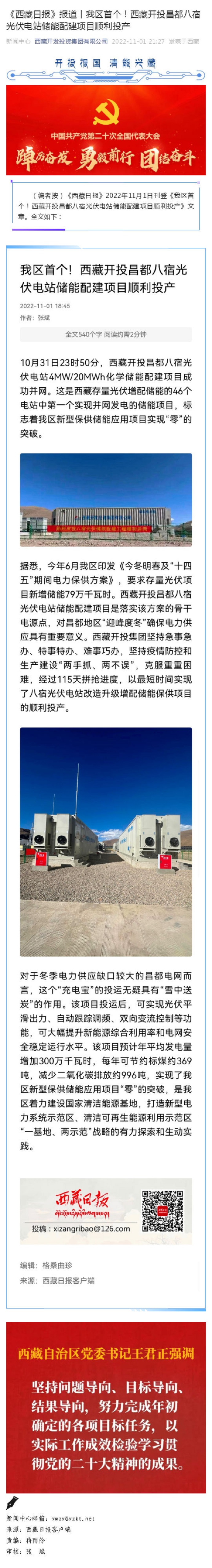《西藏日報(bào)》報(bào)道丨我區(qū)首個!西藏開投昌都八宿光伏電站儲能配建項(xiàng)目順利投產(chǎn)