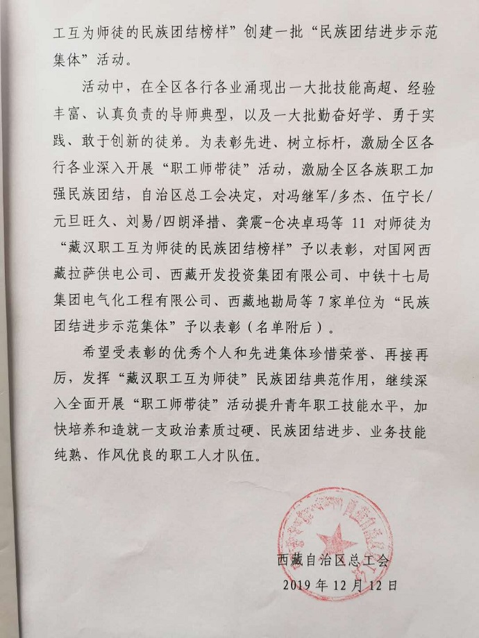 西藏自治區(qū)總工會關于選樹一批"藏漢職工互為師徒的民族團結(jié)榜樣"創(chuàng)建一批"民族團結(jié)進步示范集體"的表彰決定